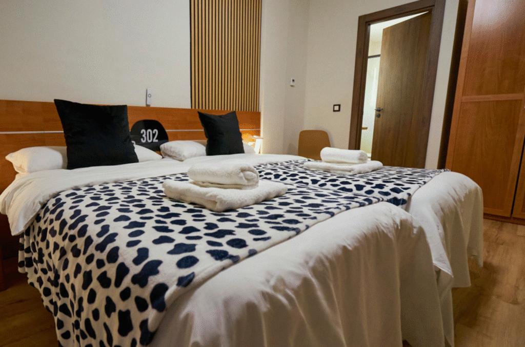 Room designed for 3 people. Equipped with a double bed (with the option of separating it) and 1 single bed, as well as a private bathroom with a bathtub, wardrobe and desk.